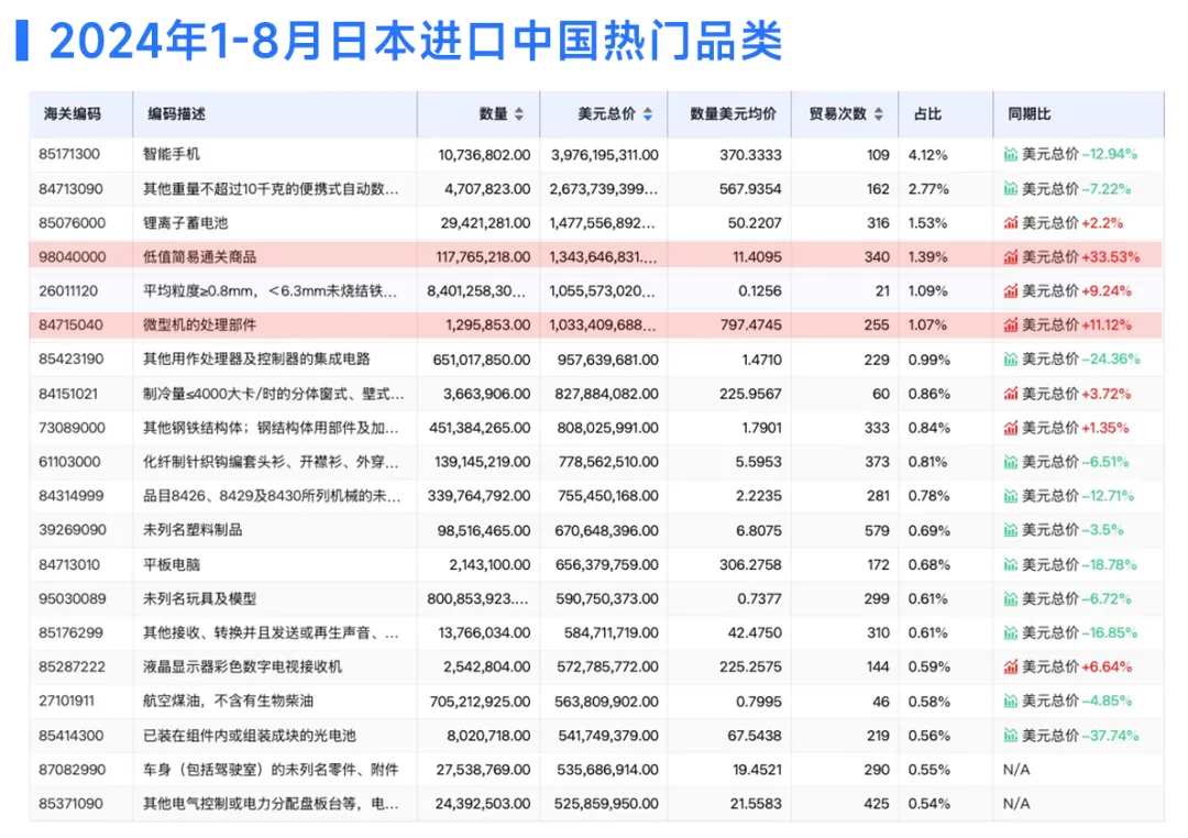 2024年1-8月日本进口中国产品的热门品类: